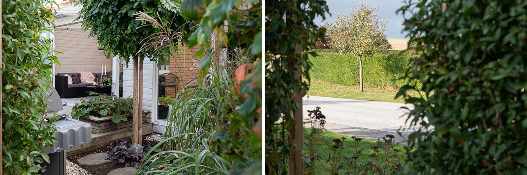 Mycket lättskötta och grönskande uteplatser. Entrésidan med sitt trädäck i österläge erbjuder härlig morgonsol. Här omges vi av bambugräs och pipranka som klättrar på det insynsskyddande planket. Vid entrén finns även ett separat förråd.