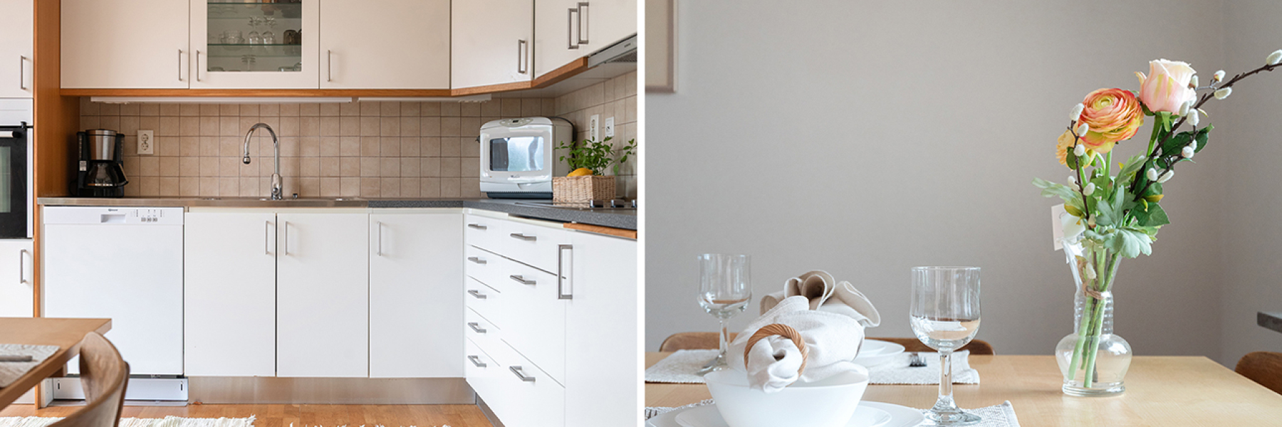 Vardagsrummet vetter åt framsidan och är trevligt och social planerat med fönster i burspråk. Köket ligger mot innergården och har en balkongdörr till det trivsamma uterummet. Köksinredning från Vedum. Köksskåpen är ljusa och bänkskivan av grå laminat. Ovanför bänkskivan sitter ljus kakel. Köket är utrustat med kombinerad kyl och frys, inbyggnadsugn med varmluft, spishäll, fläkt och diskmaskin. Köksinredningen går hela vägen upp till taket. Praktiskt och lättskött.