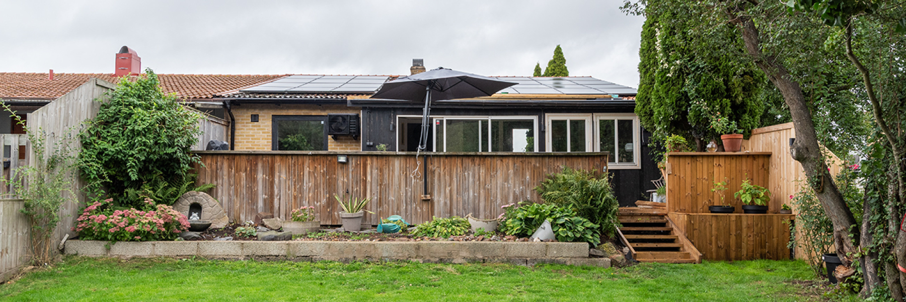 Vi möts av en entré med upphöjda murade perenrabatter. Trädgårdssidan i söderläge har dels ett trädäck i anslutning till huset och ett i kanten av gräsmattan. Här slår man sig ner och njuter av solen. På det större trädäcket finns även ett härligt spabad. Trädgården erbjuder även vackra perenner och odlingslådor.